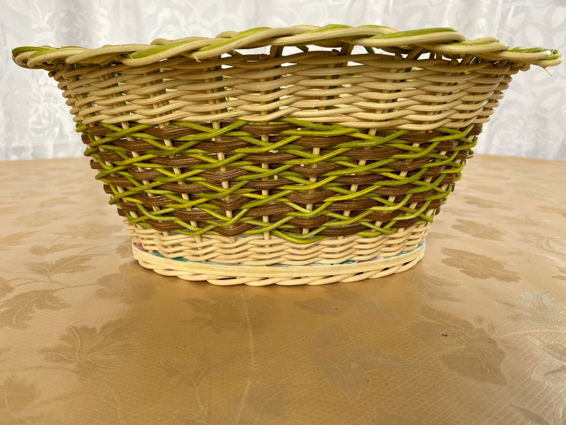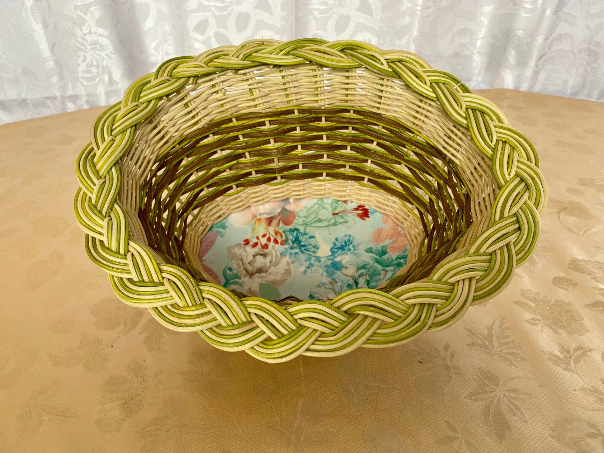 Handgeflochtenes ovales Körbchen aus Peddigrohr. Der Boden ist mit abwaschbarer Folie beklebt und das Flechtmaterial ist mit Peddigrohrlack versiegelt. Die Maße des Bodens sind 20 x 12 cm und die Flechthöhe ca. 12 cm