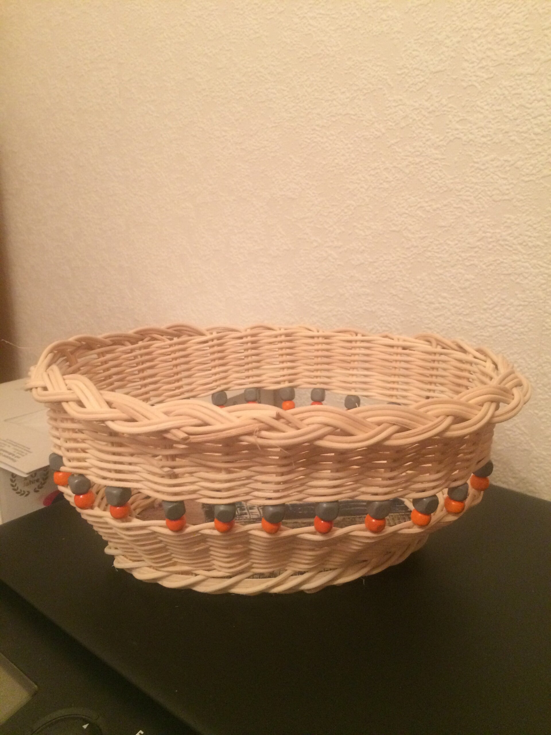 Handgeflochtenes ovales Körbchen aus Peddigrohr. Der Boden ist mit abwaschbarer Folie beklebt und das Flechtmaterial ist mit Peddigrohrlack versiegelt.