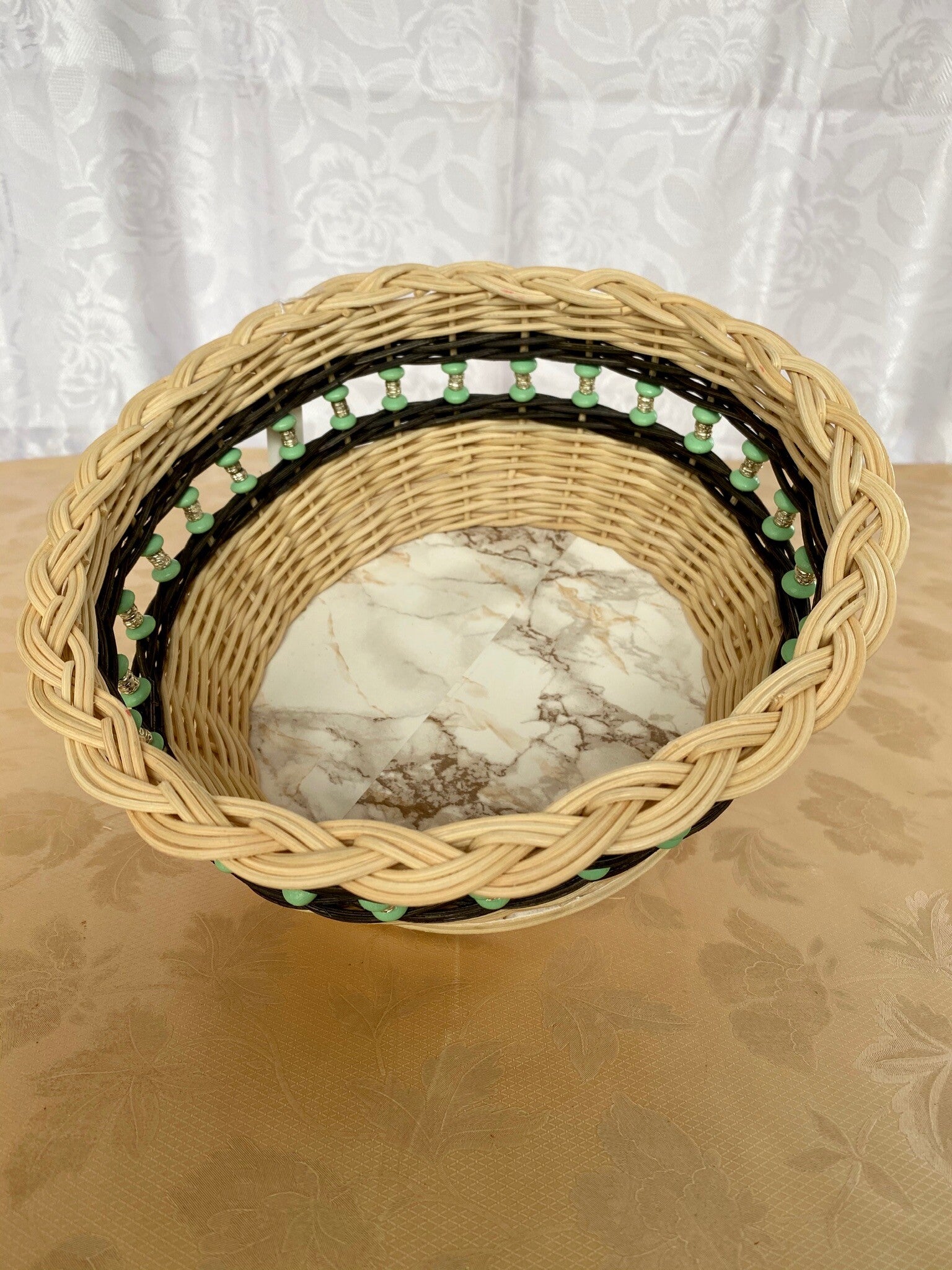Handgeflochtenes rundes Körbchen aus Peddigrohr. Der Boden ist mit abwaschbarer Folie beklebt und das Flechtmaterial ist mit Peddigrohrlack versiegelt. Der Durchmesser des Bodens ist 18 cm.