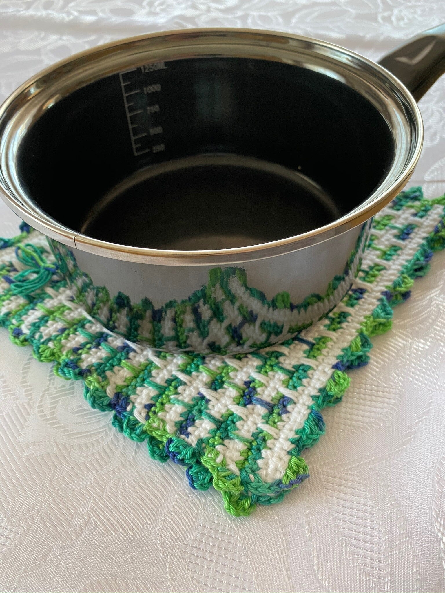 Wunderschöne doppelwandige Topflappen mit Umrandung. Kein Fingerverbrennen mehr. Ideal als Mitbringsel oder auch zum Selbstbehalten. Gehäkelt aus hochwertigem Baumwollgarn, super griffig. Kann auch als Untersetzer verwendet werden. Größe 20 x 20 cm, 100% Baumwollgarn, waschbar bei 40 Grad, nicht in den Trockner !!!