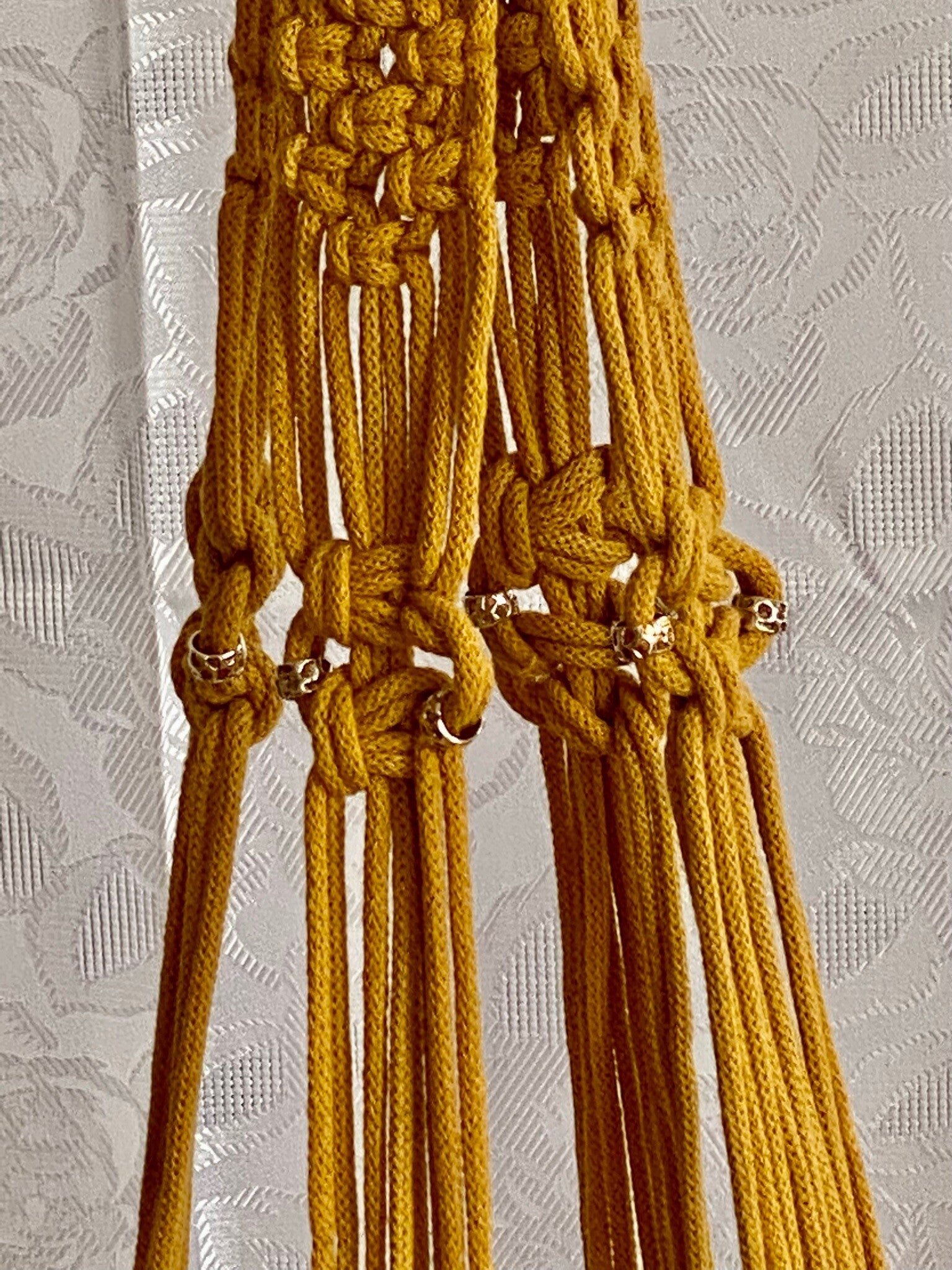 Handgeknüpfter senffarbener Hängetisch. Er hat Zimmerhöhe, ca 280 cm, wobei die unteren Bänder noch individuell gekürzt werden müssen. Der Durchmesser der Holzschale beträgt 40 cm und die Garnstärke 6 mm. Der Rand der Schale hat eine Höhe von ca. 2,5 cm.