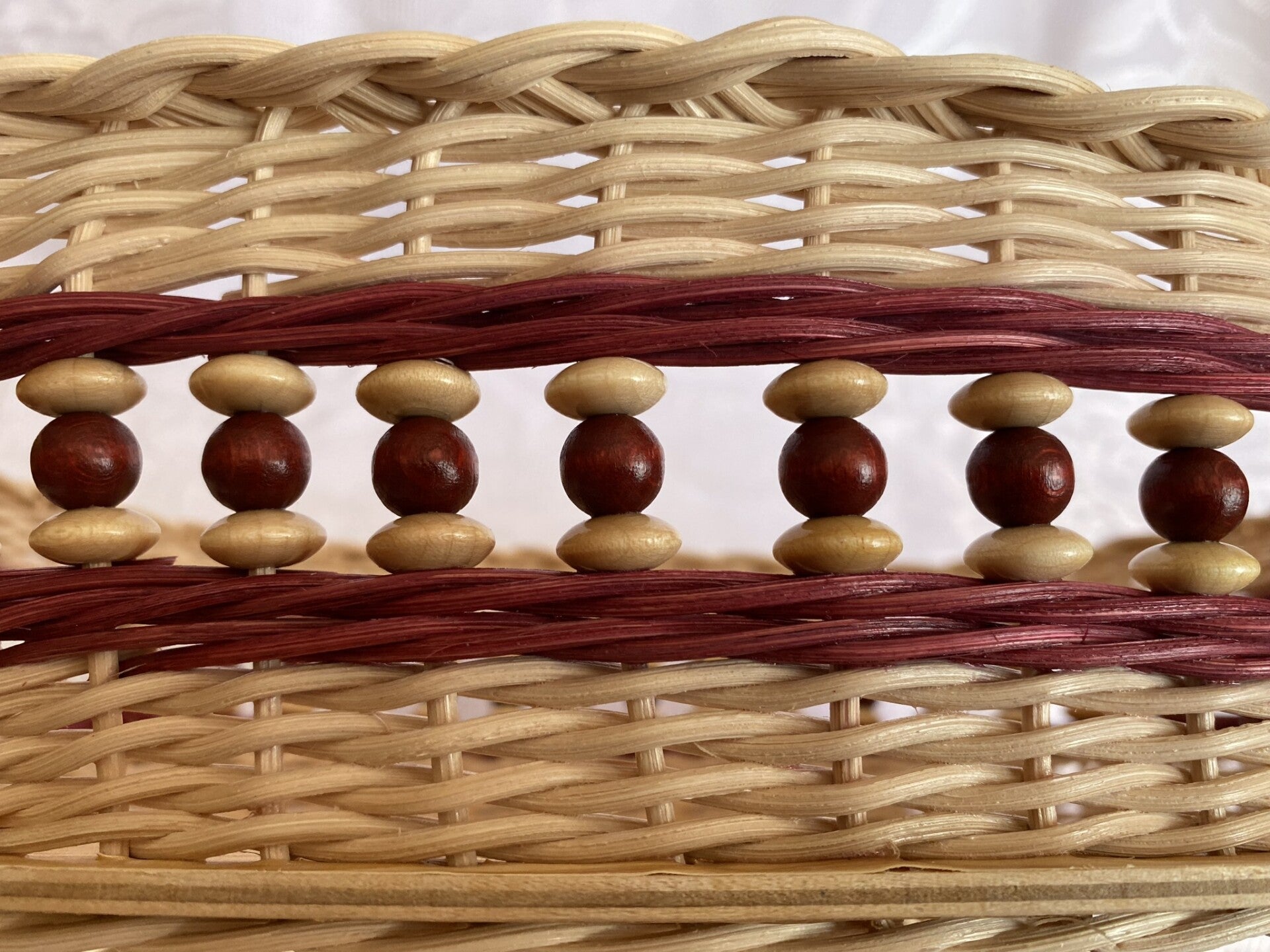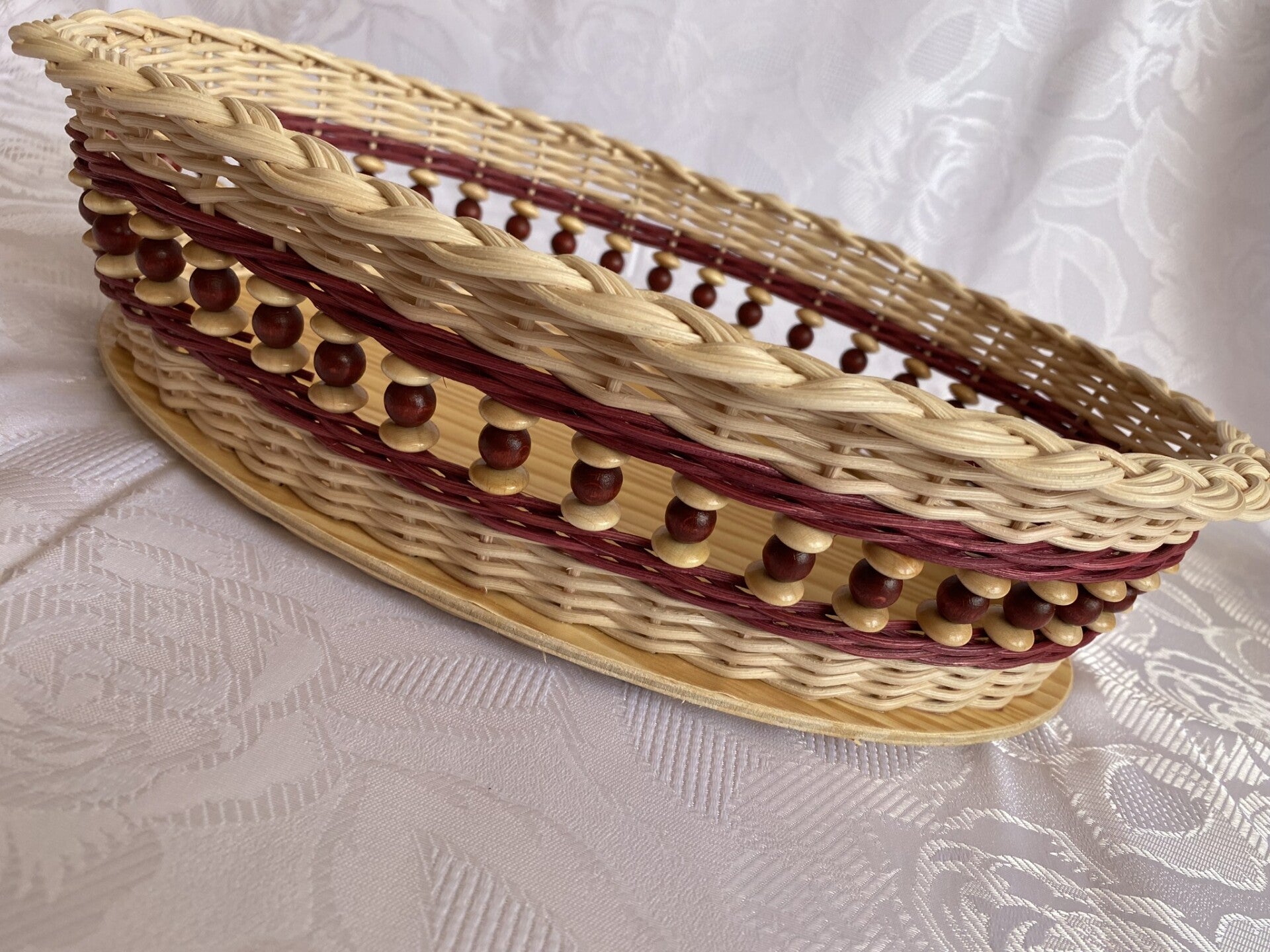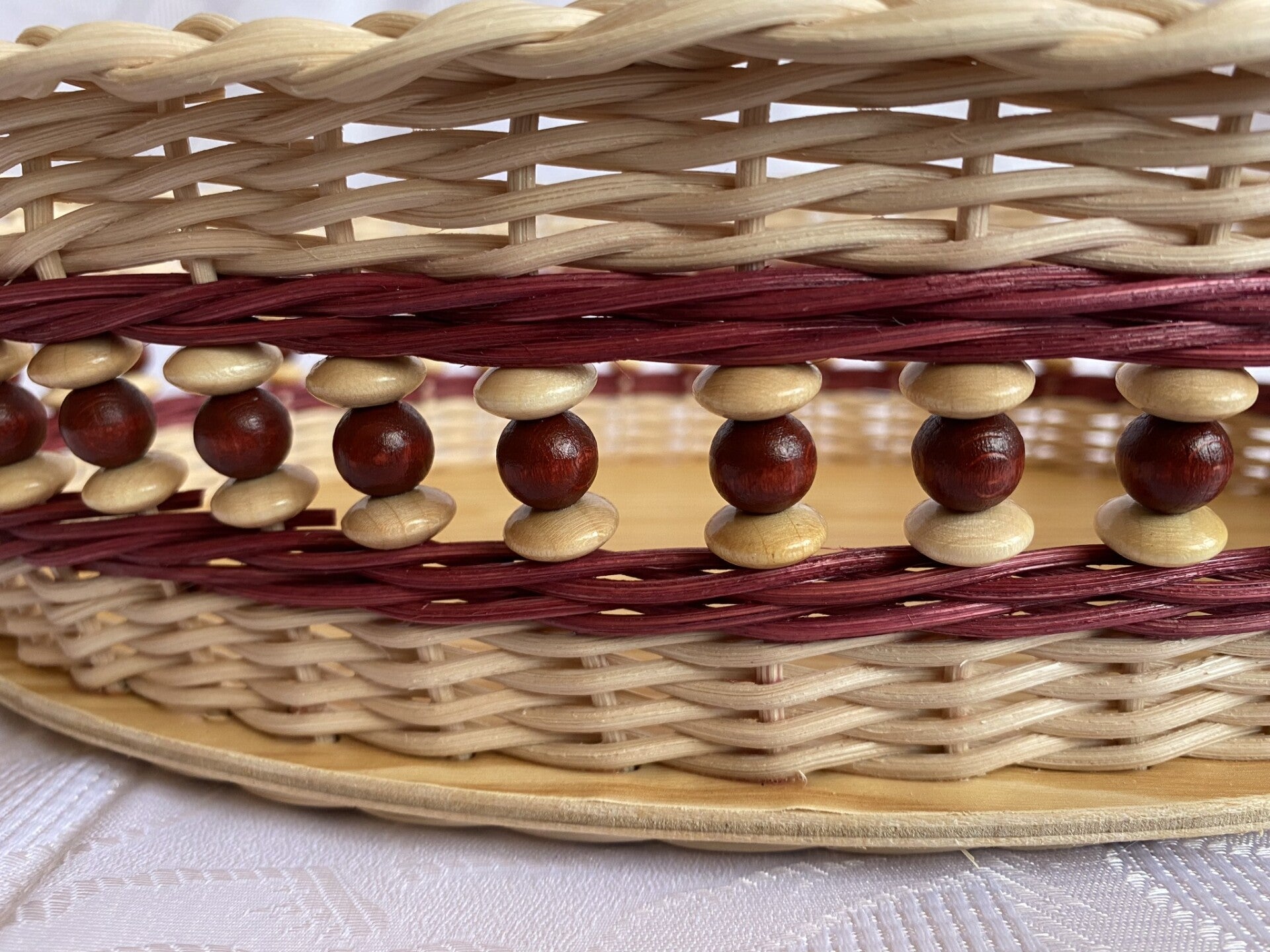 Aus Peddigrohr geflochtener ovaler Korb. Der Boden ist mit abwaschbarer Folie beklebt und das Flechtmaterial ist mit Peddigrohrlack versiegelt. Die Holzperlen sind Speichelfest und Schadstofffrei.
