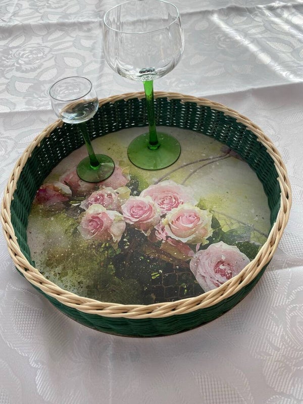 Ein ganz toller Hingucker. Dieses wunderschöne aus Peddigrohr geflochtene runde Tablett darf in keiner modernen Wohnung fehlen. Der Durchmesser des Bodens beträgt 29 cm und die Höhe des Randes ca 6 cm