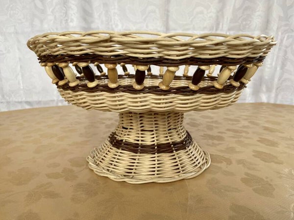 Korbwaren sehen dank kunstvoller Flechtung nicht nur toll aus, sondern können auch besonders vielseitig verwendet werden. Diese geflochtene Schale mit Fuß macht sich gut als Blickfang in der Wohnung. Nutzen Sie sie als Obstschale oder für herzhaftes Gebäck oder süße Backwaren. Auch zum Aufbewahren von Alltagsgegenständen ist sie ideal. Neben dem praktischen Nutzen macht sie auch als Dekoelement eine sehr gute Figur. Das Flechtmaterial ist mit Peddigrohrlack versiegelt und kann mit einem feuchten Tuch ganz einfach gereinigt werden. In der Seitenwand sind schöne Holzperlen verarbeitet. Diese sind Speichelfest und Schadstofffrei.
