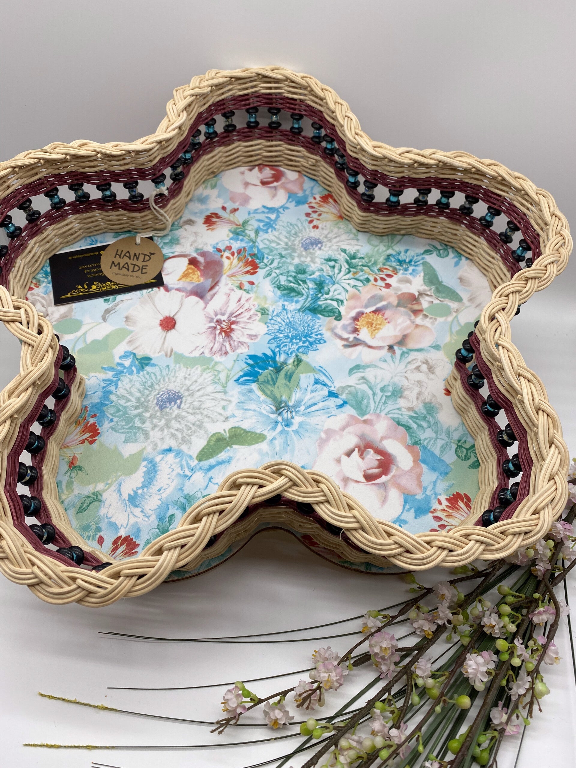 Ein wunderschönes Tablett zum Servieren in Form einer Blume. Der Boden ist mit abwaschbarer Folie beklebt und das Flechtmaterial ist mit Peddigrohrlack versiegelt. Somit ist alles mit einem feuchten Tuch ganz leicht zu reinigen. Der Durchmesser beträgt ca. 40 cm und die Randhöhe ca. 9 cm.