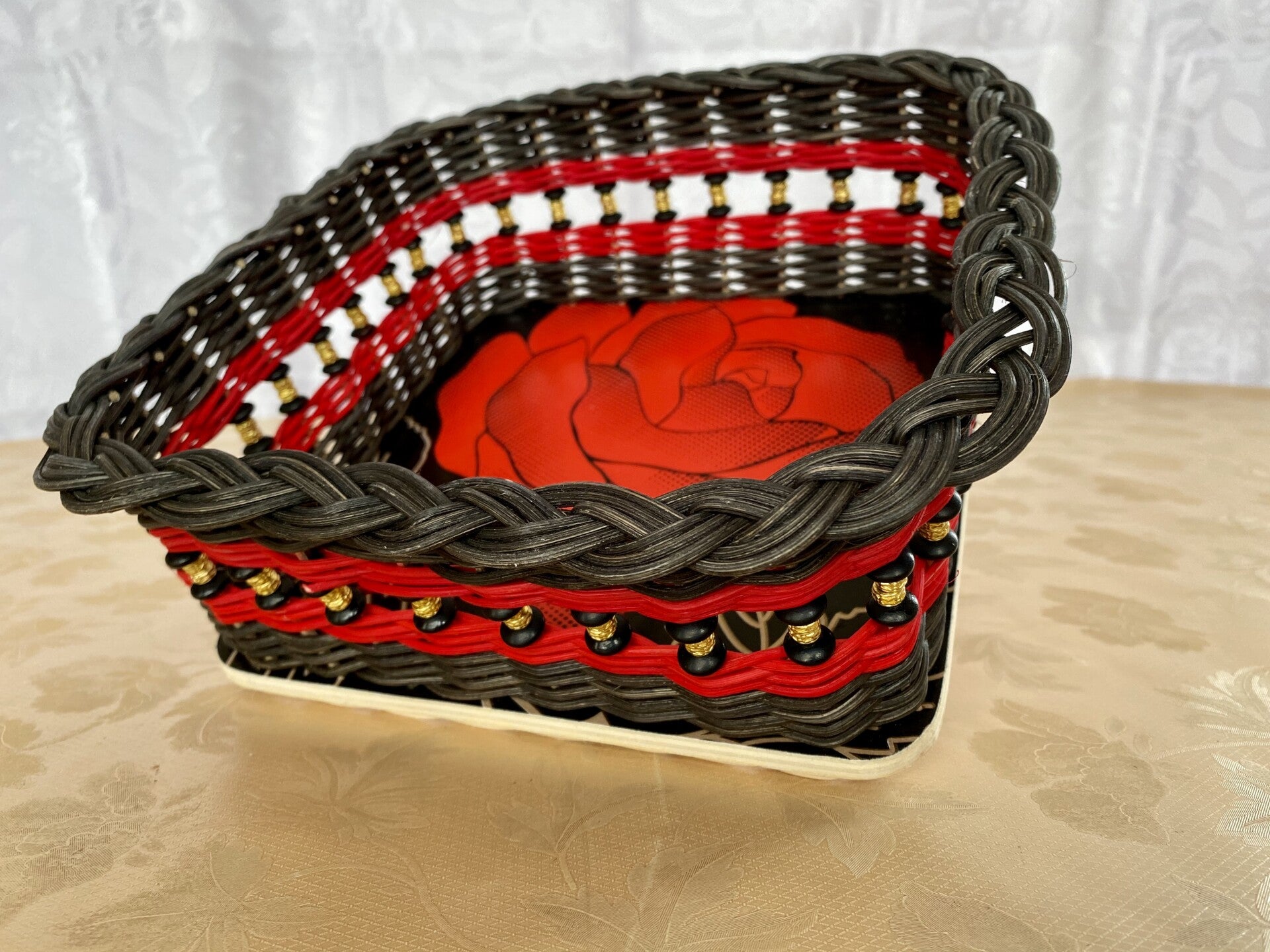 Dieser quadratische Korb ist aus Peddigrohr geflochten. Der Boden ist mit abwaschbarer Folie im Rosendekor beklebt. Das Flechtmaterial ist mit Peddigrohrlack versiegelt, somit ist alles mit einem feuchten Tuch einfach zu reinigen. Alle verwendeten Materialien sind schadstofffrei. Die Maße des Bodens sind 20 x 20 cm, des oberen Randes 25 x 25 cm und die Höhe ca 9 cm. Den oberen Abschluß bildet ein sehr eleganter schmaler Zopfrand.