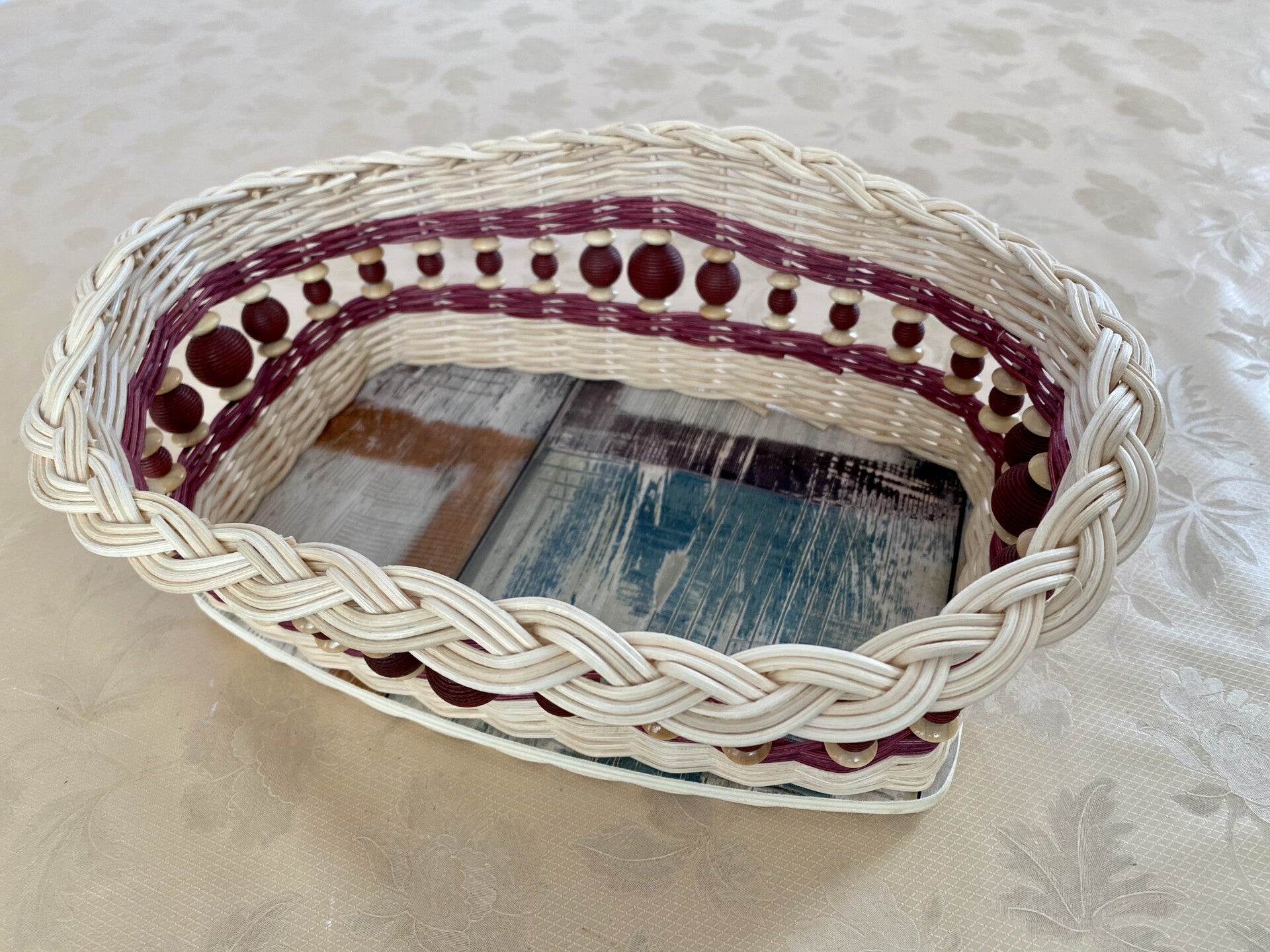 Handgeflochtenes rechteckiges Körbchen. Der Boden ist mit abwaschbarer Folie beklebt und das Flechtmaterial ist mit Peddigrohrlack versiegelt. Metallperlen sind Bleifrei, Cadmiumfrei und Nickelfrei und die Holzperlen sind Speichelfest und ebenfalls Schadstofffrei. Die Maße des Körbchens sind am Boden 16 x 24 cm, am oberen Rand 22 x 30 cm und die Höhe beträgt 11 cm