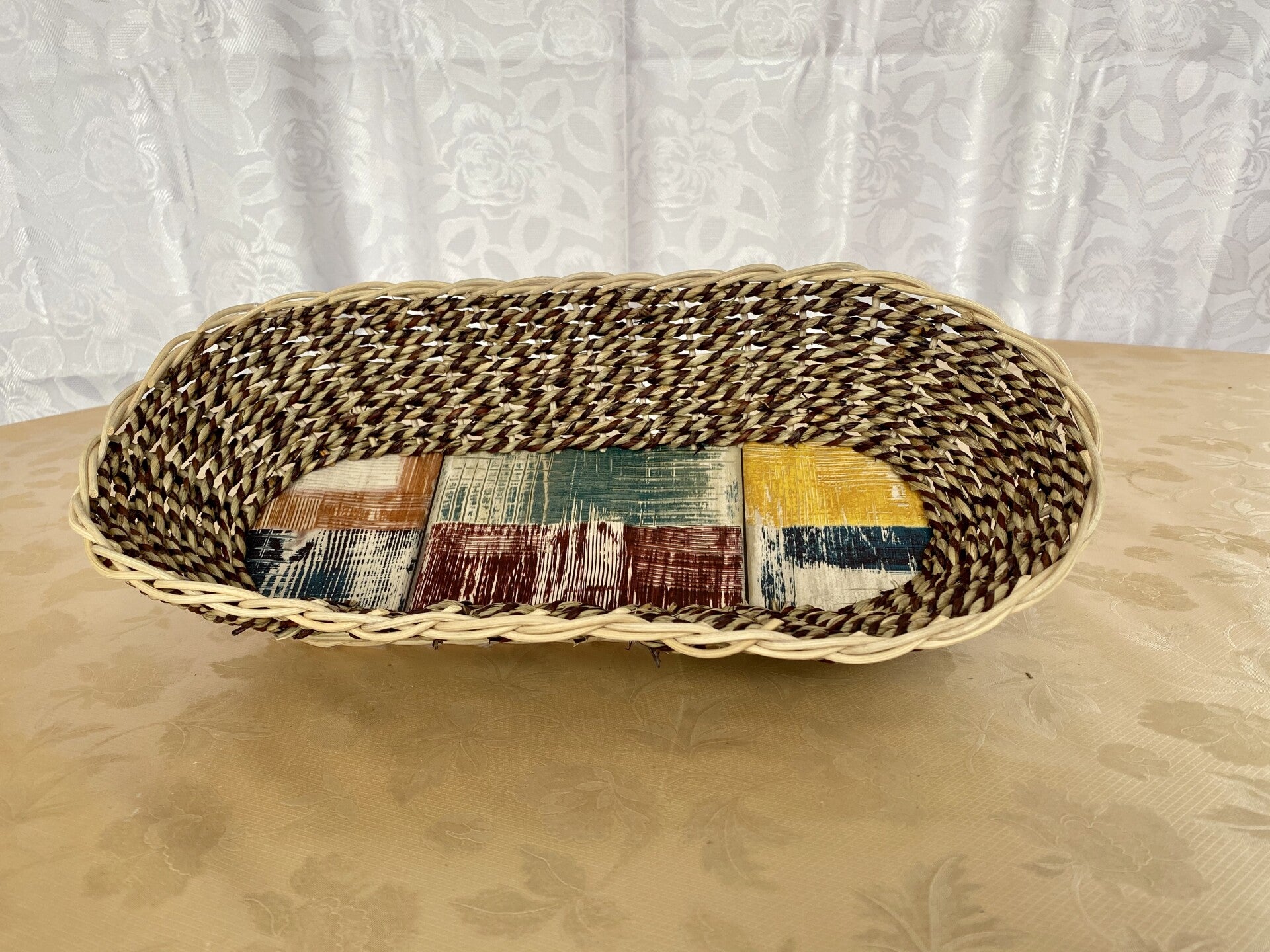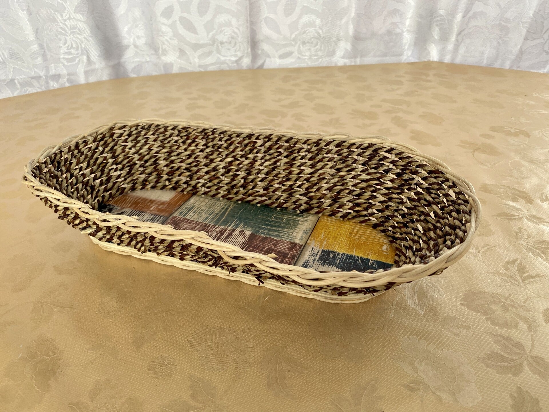 Dieser wunderschöne beige-braune Korb ist aus Seegras geflochten und ein echter Hingucker. Durch seine elliptische Form ist er ein einzigartiges Kunstwerk. Der Boden ist mit abwaschbarer Folie beklebt und das Flechtmaterial ist mit Peddigrohrlack versiegelt, so daß man alles ganz einfach mit einem feuchten Tuch abwischen kann. Die Maße des Bodens sind 11 x 32 cm, des oberen Randes 21 x 41 cm und die Höhe beträgt 8 cm. Dieser Korb besticht durch seine ganz schlichte Eleganz. Er ist ein besonderes Schmuckstück welches selbstverständlich auch genutzt werden sollte. Sei es als Dekoration oder ganz klassisch für Brötchen auf dem Frühstückstisch. Ich wünsche dir viel Freude mit diesem einzigartigen Korb.